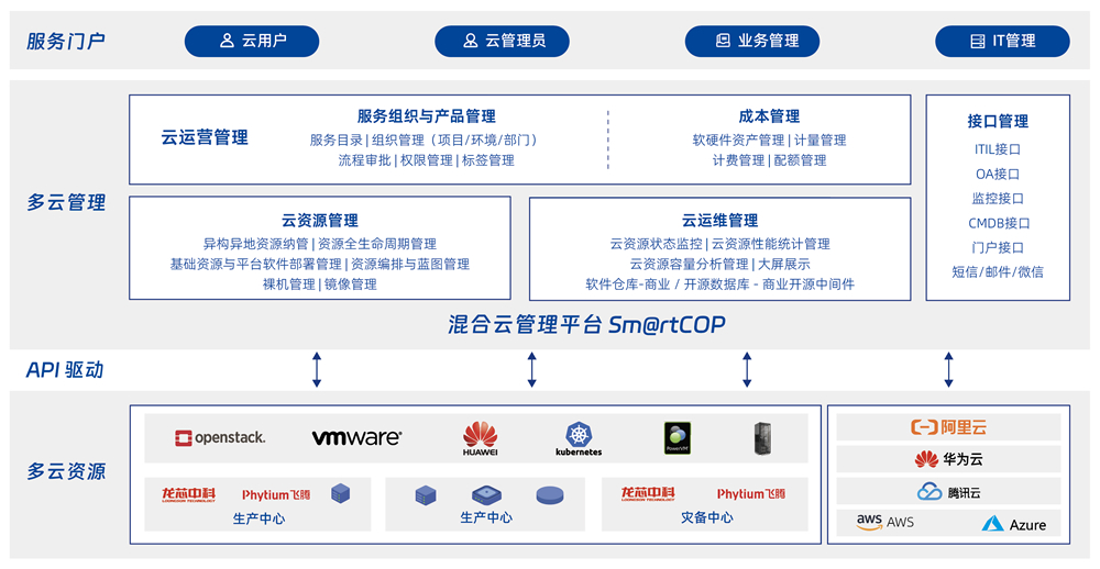 面向各行业用户多云资源管理、、运维及服务提供的综合挑战,,,,提供异构异地异芯片多云资源的统一管理、、、、统一运维、、、统一监控及统一运营服务,,,,简化多云管理复杂度,,,,提升用户用云满意度,,,释放云平台业务价值。。