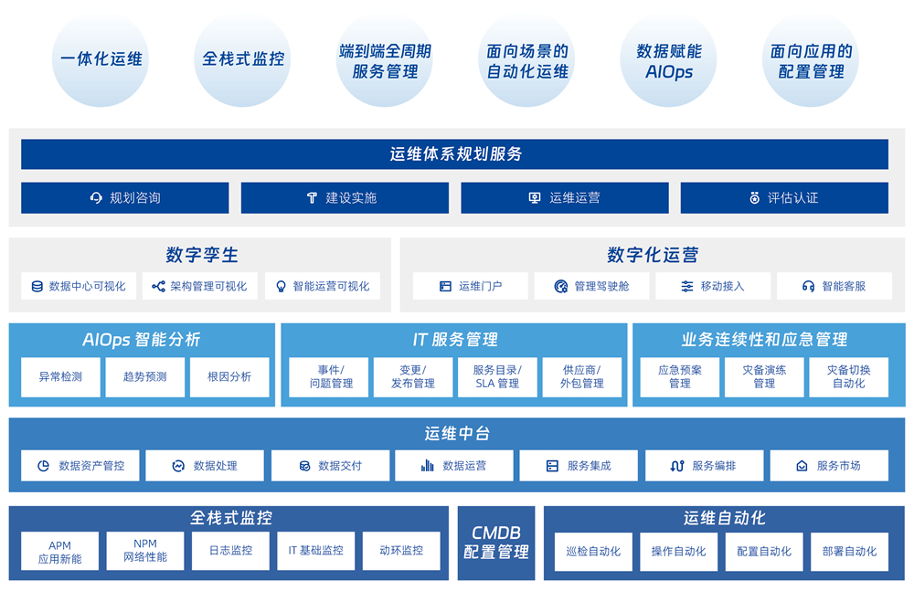 针对数字化时代对运维管理的需求,,,自主研发的“监管控析”一体化智能运维解决方案。。。。平台以客户和业务场景为导向,,,通过全业务的数据和流程整合,,,同时支持传统 IT 架构和云技术架构的“双态 IT”运维,,,实现可视化、、、、场景化、、、自动化、、、、精细化的智能运营管理,,,提升用户体验及运营效率,,,助力内外部生态的数字协同和价值创造。。