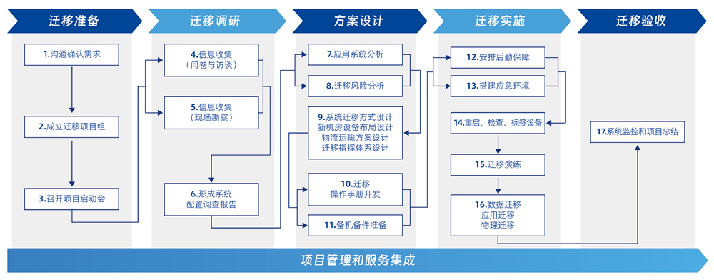 帮助客户进行数据中心的各类迁移服务,,包括传统数据中心及新一代云数据中心的 IT 基础设施设备迁移、、、系统迁移、、、数据迁移、、应用迁移、、同城灾备/双活、、异地容灾等各类场景迁移。。。。设备包含主机、、、存储、、、网络、、服务器、、云平台、、、数据库、、、中间件、、、应用、、、灾备系统等各类软硬件。。。迁移服务通过制定迁移策略和计划,,,组织高效、、、、准确地执行迁移,,,,并在既定等停机窗口内完成数据中心的搬、、迁、、、建、、管、、谋等过程。。。。 一站式集成迁移服务能力:新一代数据中心规划、、、、建设、、、优化、、、容灾、、、迁移、、、、物流、、备件、、运维